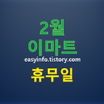 2월 이마트 휴무일, 이마트 휴점일, 이마트 쉬는 날은? 대형 마트는 아무때나 참 편리하게 이용할 수 있습니다. 특히 주변에 이마트, 롯데마트, 홈플러스등이 가까이 있으면 살기 좋은 것으로 인식되지요. 아이가 있는 경우에는 특히 더욱 그렇습니다. 이렇게 편한 대형 마트도 주변의 상권을 보고 해 주기 위해서 한달에 두번 쉬게 됩니다. 아무 생각없이 이마트, 롯데마트에 일요일에 갔다가 모두 불이 꺼져있는 광경을 경험한 분들은 이마트 휴무일, 롯데마트 휴무일, 홈플러스 휴무일을 챙기게됩니다. 그래서 오늘은 2월 이마트 휴무일에 대해 알아봅니다. 기본적으로 대형마트 휴점일은 둘째 주, 넷째 주 일요일 입니다. 2월 이마트 휴무일은 2월 12일, 2월 26일 입니다. 끝!~ 하면 편하겠지만 점포마다 조금씩 휴무일..