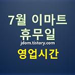 7월 이마트 휴무일 영업시간 정리 7월 이마트 휴무일 영업시간에 대해 알아봅니다. 이마트 휴무일 영업시간을 찾는 방법과 7월 이마트 휴무일을 직접 정리했어요. 아무래도 이마트를 자주 찾다보니 매달 이마트 휴무일 부터 확인하네요. 너무나 당연하게 느껴지지만 꼭 필요한 물건이 있는데 마트가 휴무일이면 가끔 난감한 일이 생길수도 있습니다. 간혹 아이와 언제까지 무언가 사주기로 약속 했는데 그날이 휴무일이고 마트에서만 판다면 문제가 커지는거죠. 그래서 대략 주변에 있는 이마트 휴무일, 홈플러스 롯데마트 휴무일은 알고 있으면 편리합니다. 계획적 소비에도 좋구요. 보통은 매월 2번째, 4번째 일요일에 거의 모든 대형마트, 기업형 슈퍼마켓이 공통으로 휴무일입니다. 문제는 해당날짜에 동네 재래시장도 함께 쉰다는거죠. ..